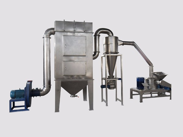 物料由料斗經(jīng)螺旋輸送器進(jìn)入粉碎室,被高速旋轉(zhuǎn)的刀片剪切粉碎,通過負(fù)壓風(fēng)運(yùn)的方法把物科運(yùn)入旋風(fēng)分離器、袋式除塵器,排出物料達(dá)到產(chǎn)品的要求。